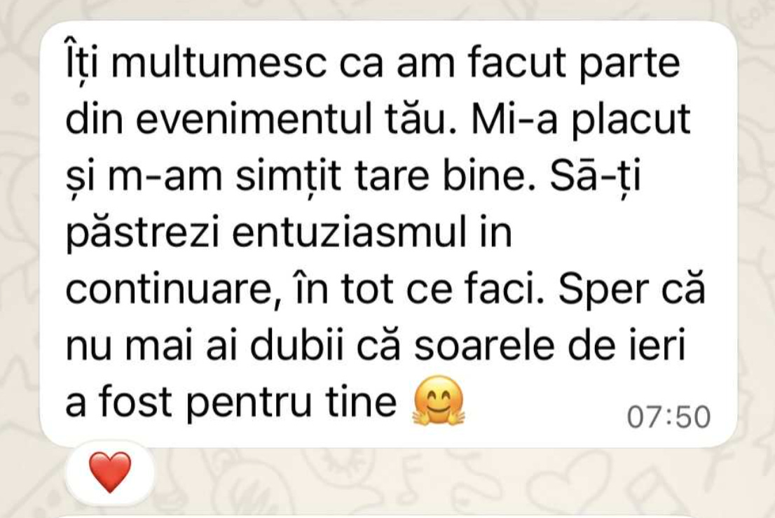 Păstrez răspunsurile și îmi promit să revin la ele în zilele complicate sau când mi se face dor de felul în care am trăit ziua de 11 octombrie 2025, alături de o mână de oameni din prima linie a vieții mele care, așa cum mi-a spus o prietenă, reflectă o bucățică din mine.