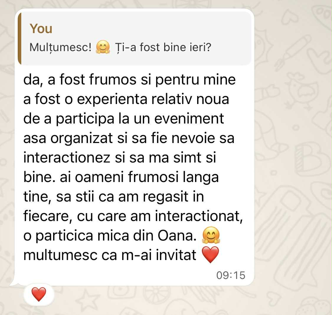 Aleg să împărtășesc despre experiența asta pentru că eu însămi am învățat multe odată cu punerea ei în scenă. Dar și pentru că evenimentele făcute cu grijă și intenție rămân forța invizibilă a oricărei comunități. Deși containerul este foarte personal, găsești recomandări universale, pe care le poți explora în partea ta de lume.